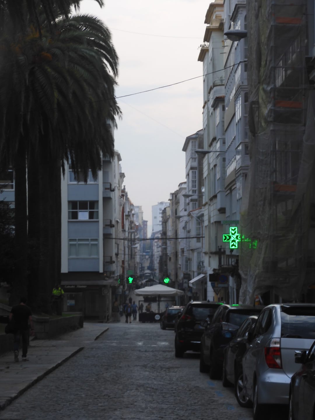 Gisteravond nergens pasta, maar er zit wel een authentiek Spaans restaurant op drie minuten van ons hotelletje. Ik zie op de kaart nergens de Gallische groentesoep. De behulpzame ober vermaakt zich uitstekend met deze twee grijze ladies (wij willen een echte menukaart en niet via een Q-site). Hij wijst nadrukkelijk naar de kaart, maar kan dan tot zijn eigen verbazing en onze vrolijkheid de soep ook niet vinden. Marja wil een mixta salade, een grote. Hij schudt weer nadrukkelijk zijn hoofd, een kleintje is echt genoeg. Nee, ook geen frites erbij. Wel tevreden is hij als wij er de groene pepertjes uit Padron bij nemen. We krijgen de kleine porties en het is veel te veel!