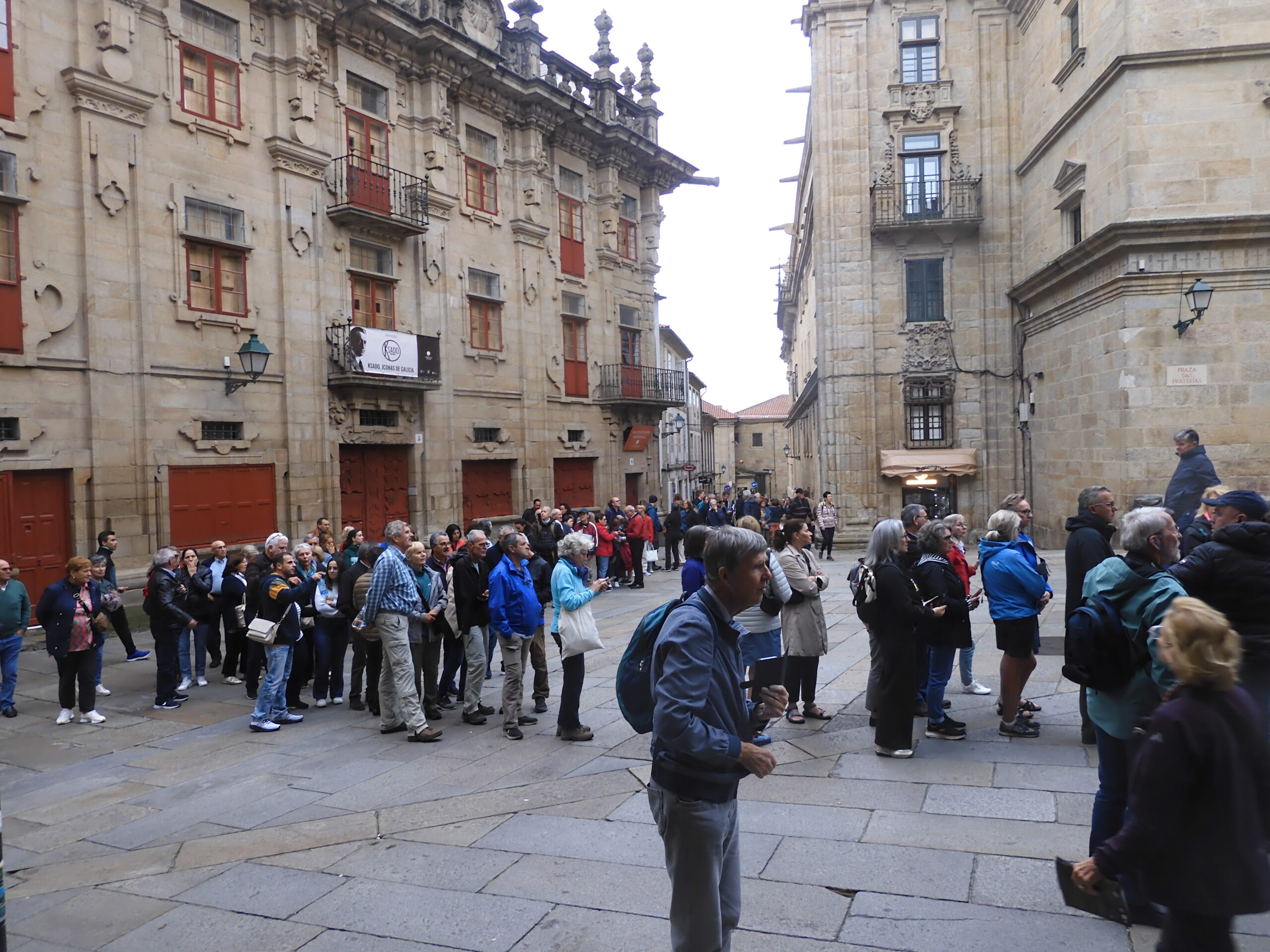 De dag in Santiago vliegt om. We treffen onder anderen Karin op het plein. Een zonovergoten plein met veel bruiloften; een veel betere sfeer dan gisteren, toen er bij onze aankomst een pro-Palestina demonstratie was. Voor – en tegenstanders waren het er over eens, dat hoort niet bij de kathedraal! Dit hoort een plek te zijn van vrede, waar je elkaar ontmoet, omhelst, waar iedereen elkaar accepteert en niet een plek waar mensen tegenover elkaar staan of willen dat je daar partij kiest. Eigenlijk ook wel ironisch als je bedenkt dat Sint Jacob wordt gezien als de bevrijder van Spanje van de Moren/Arabieren/Moslims en zij nu hier aandacht vragen voor hun vrijheid. Het moge duidelijk zijn dat het mij niet gaat om hun wel of niet gelijk, maar om het feit dat het voor de kathedraal gebeurt.