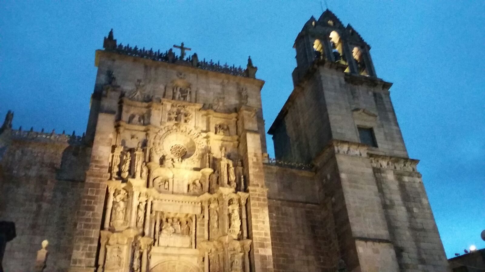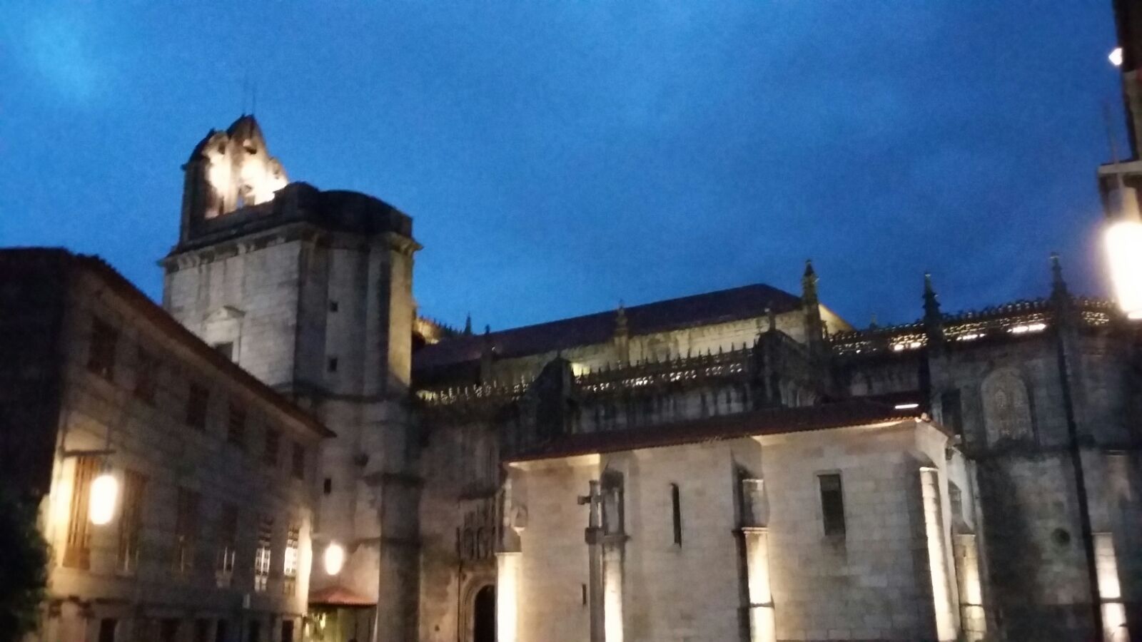 Ik kom terecht in een lief klein pensionnetje met geborduurde lakens, bloemetjesbadkamer en in het centrum, aan de route. In het standje bekijk ik van alles. Bijzonder is de Peregrina kapel, gewijd aan Maria als beschermheilige voor de pelgrims. De omtrek van de kapel is de vorm van de Jacobus schelp. Van de anderen hoor ik dat de basiliek dicht is. Na het eten besluit ik er toch nog even langs te gaan. Geluk! Er is net een speciale mis geweest en gauw glip ik nog naar binnen, wat mooi. Buiten valt de schemering in, wat het gebouw een extra dimensie geeft. Ik kan het dan niet laten en loop nog even langs ook andere speciale plekken. De winkels zijn nog open en oeps, het wordt nu toch wel heel laat in deze vreemde stad.