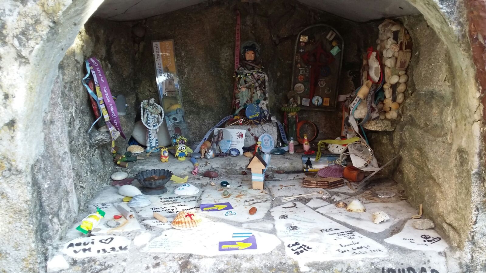 Bij Ribeira houd ik halt. Het is dan al veertig graden en rond half elf. Tegenover het café is de kapel van St. Sebastian. Ik heb thuis hele mooie miniatuurschilderingen van Sao Sebastiao, gemaakt door een goede vriend. Zijn partner heeft ernstige hartklachten en dan kom ik plots bij een kapel waarvan de heilige zoveel voor ons betekent. Ik zou geen betere plek weten voor een gebed. Op de camino heeft iedereen het altijd over loslaten, het gaat dan altijd over dingen, zaken. Maar mensen loslaten, dat is het moeilijkst, ook al weet je, iemand is oud, ziek, wil niet verder. Verstand en hart zijn twee verschillende dingen.