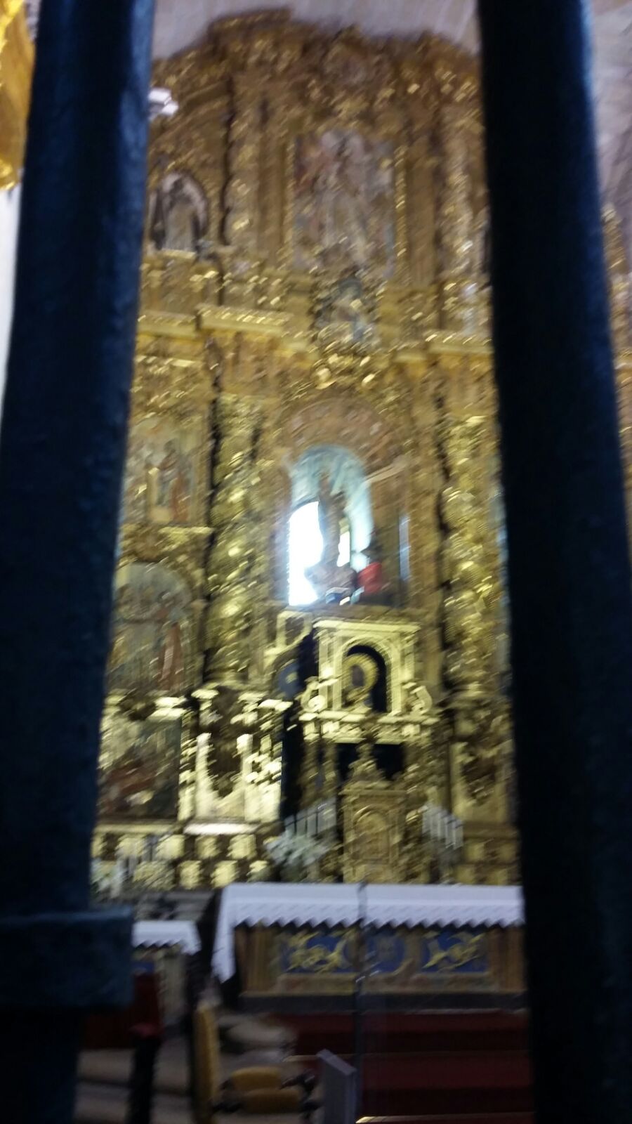 Naast mij de beveiliging. Ik raak nu toch onder de indruk. Ze zijn echt zwaarbewapend met mitrailleurs en communiceren constant met elkaar via oortelefoontjes. Niemand mag er meer in en uit. Nu ja, niemand? Regelmatig komt er nog een oud Spaans vrouwtje of mannetje aanlopen; die duwen de afzetting gewoon even weg en lopen gewoon door. Het is een toneelstukje op zich. De bewaking geeft het dan ook maar op. Deze mensen horen hier thuis, komen waarschijnlijk hun hele leven al op zondag in de kerk; wie houdt hen tegen? Genoeglijk babbelend met mijn Spaanse buurvrouwen, inmiddels drie, en sabbelend op gekregen snoepjes, vliegt de tijd om en begint de mis. En ja hoor ik heb geluk; weer zwaait het grote wierook vat. Hoezo, groot? Dacht ik gisteravond al dat hij kleiner was dan ik mij herinnerde, dat is ook zo. Dit heeft waarschijnlijk te maken met de restauratie van de kathedraal. Nog steeds indrukwekkend maar zeker de helft zo klein en daardoor geen zoefffff als hij over vliegt. Maar klein of niet, hij zwaait.