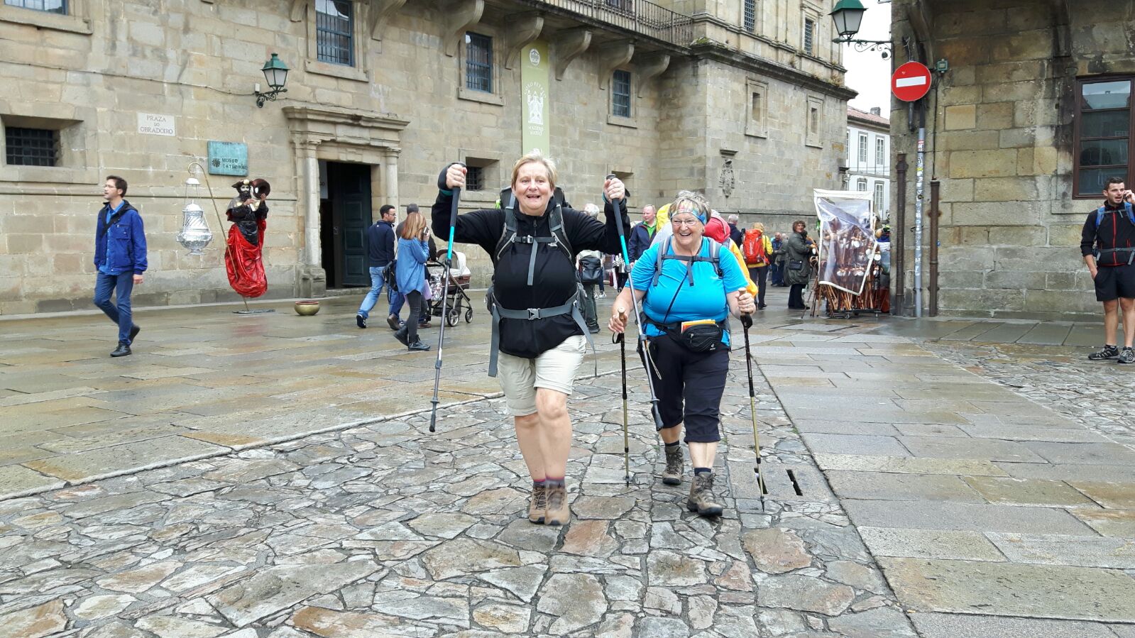 We zien in de nevels Santiago liggen. Beiden hebben we begrepen dat het van deze kant mooier is als je Santiago binnenkomt. Beiden zijn we het daar niet mee eens. De Maria Magdalenakapel is nog een mooie verrassing, maar dan rijen oude flatgebouwen, ziekenhuiscomplex, kantoren, minimaal nog pijlen en vooral nergens een bord Santiago. Andere Pelgrims lopen ook wat verloren. Zijn we nu wel of niet in Santiago? Mensen wijzen dat we gewoon rechtdoor moeten lopen en dat doen we dan maar. Ineens worden de straatjes smaller en daar zijn bekende stemmen. Jullie zijn er! Ik breng nog uit: Nee, eerst naar de kathedraal. Marjan grijpt mij bij de arm en zegt kom maar mee. De wereld draait, daar is de kathedraal. Ik ben er en als offer ledig ik mijn maaginhoud in de put… En nu van alle kanten water/drinkflessen, tissues, maar ik voel mij opgeknapt. Theorie 1: misselijk door de ontsteking. Theorie 2: ik heb ergens wat koffie binnengekregen en daar ben ik heel allergisch voor. Theorie 3: behekst. Nu gaan mijn stokken omhoog, het maakt allemaal niets uit, ik ben er!