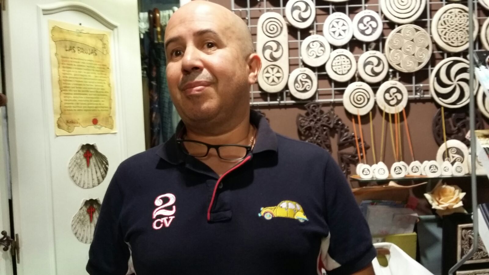 Zo nu eerst toch opzoek naar wat cadeautjes en spulletjes voor mijn miniatuur caminoproject. Eigenlijk wil ik ook twee ansichtkaartjes voor Joep en Sam, gewoon twee kinderkaarten. Vergeet het maar. Nergens! Ik kom wel bij een winkeltje waar de man een shirt aan heeft met een klein autootje, een lelijk eendje. Ik wijs erop en steek mijn duim omhoog. Een brede grijns en even later zit ik de foto’s te bekijken van zijn echte uit 1980. Als er echte klanten binnen komen lacht hij spijtig, zaken gaan voor.
