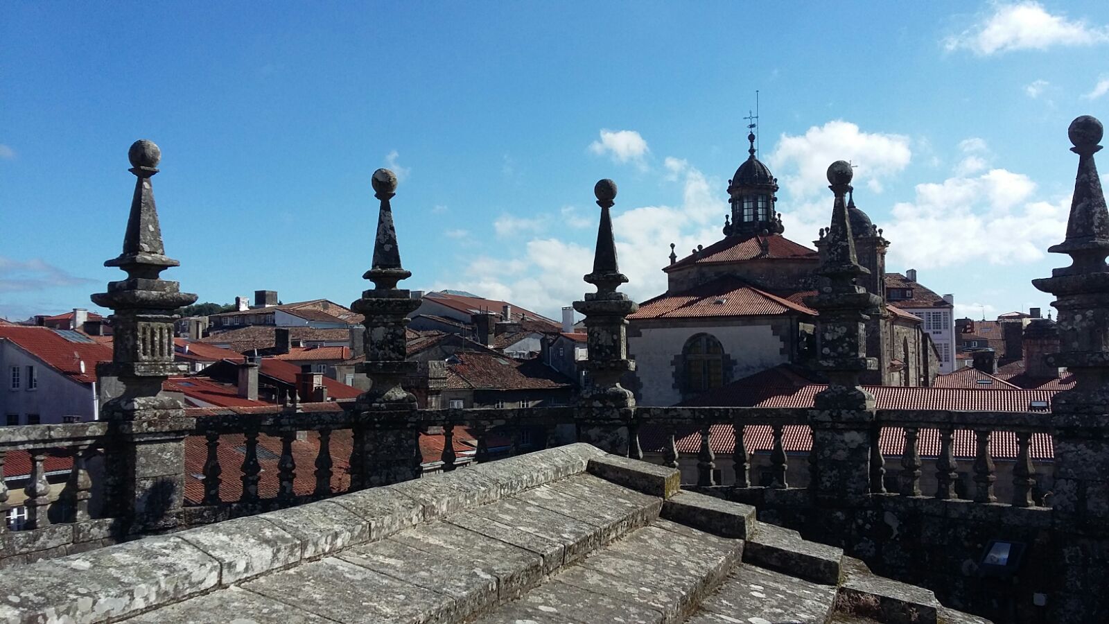 Om 11.00 uur omhoog voor een Spaanse rondleiding over de daken van de kathedraal. Help, waarom wil ik dit? De wenteltrap valt nog wel mee en dan staan we boven op een schuin dak met aflopende treden/dakbekleding en giert de wind om mijn kop. Ik zie Jacobus nu niet vanaf het plein maar aan de achterkant en wel heel dichtbij. Gelijk maar een schietgebedje en gelukkig wat helpende handjes van een groep Engelse dames. Het uitzicht is natuurlijk prachtig. Ik kreeg van Herman de tip om een steentje van het dak mee te nemen. En ineens zie ik daar een steentje liggen, zwart. Hoe het daar gekomen is, weet ik niet, maar deze is voor mij. Ik scharrel over de daken en geniet met een angstig kloppend hart.