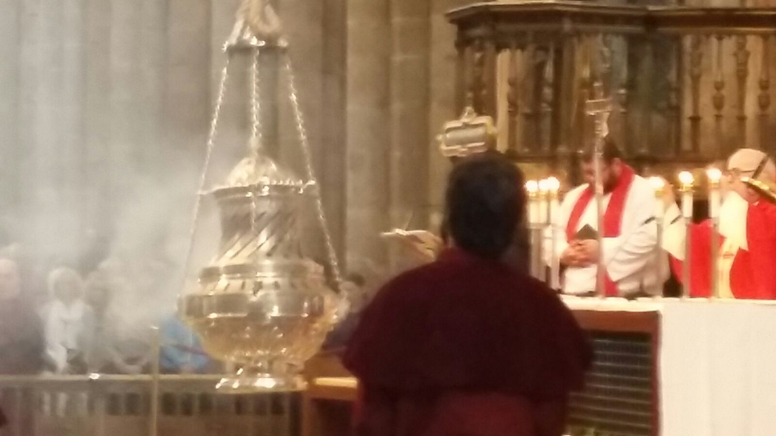 Ik ga maar direct op de grond zitten; twee uur staan lijkt mij iets teveel van het goede. Zoveel bekende gezichten. Het is opmerkelijk dat ik in zo’n kort tijdbestek – en ik heb heel veel alleen gelopen – toch zoveel mensen heb leren kennen. De spanning stijgt. Het wierookvat gaat omhoog en samen met het gezang en de geur van wierook blijft het indrukwekkend. Nu voel ik mij echt aangekomen.