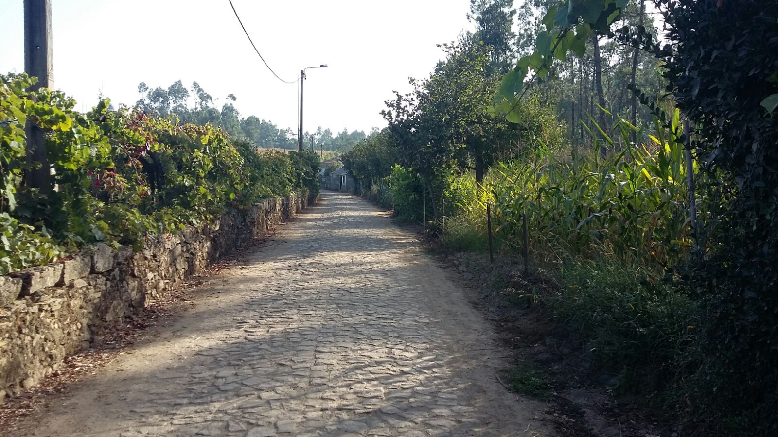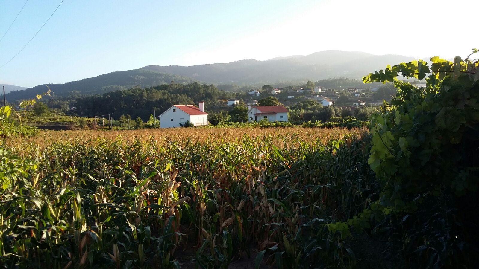 In het eerste café zie ik in de krant dat gisteren alle weerrecords in Portugal zijn verbroken: de heetste dag, de heetste nacht, de hoogste vochtigheidsgraad etc. etc. Wat ben ik blij dat ik tijdig gestopt ben, want vandaag gaat het super. Ik loop door bossen, omhoog en omlaag langs druiven velden, soms ook eronderdoor. Het is heel apart, allemaal maïs met wijn eromheen, oftewel de maïs voor het gewin en de wijn voor de zin. Ik kan mij niet bedwingen en pluk een enkel druifje, mmmmmmm. Ik zie ook struiken met besjes, heel verleidelijk; ik ken ze niet ,dus maar niet eten.