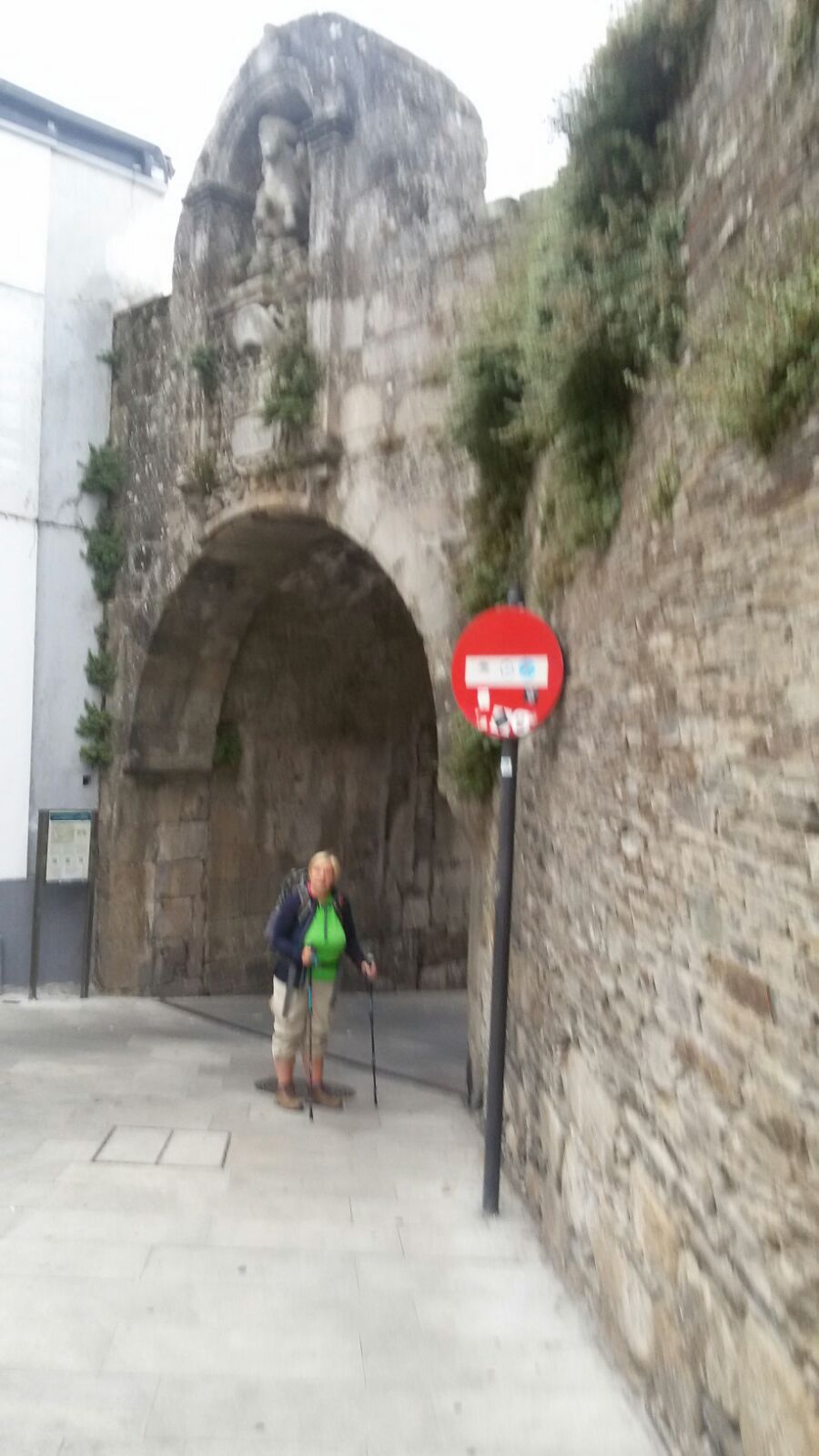 Ik zwerf een beetje met angst de stad uit omdat ik op de traditionele route naar Melide wil komen, maar vanaf hier zijn diverse alternatieve routes mogelijk. Het is superdruk, overal pelgrims en kinderen die naar school gaan. Een agente probeert alles te regelen: haar fluitje, oh nu pelgrims, nee nu kinderen, nee nu auto’s met ouders en kinderen, oh daar weer pelgrims, tuut tuut tuut. Ik loop, toepasselijk, door de poort van Santiago de stad uit, uitgezwaaid door een Romeinse legeraanvoerder en via een Romeinse brug. Daarna oersaai lopend langs een asfaltweg, kilometer na kilometer, af en toe een razende auto maar voor mijn ogen eindeloos asfalt. Gelukkig, na bijna tien kilometer een bar. Ik had al een sandwich besteld – en dat zijn hier twee halve stokbroodjes – als ik mij ineens herinner dat deze plek bekend staat om zijn kaas met honing. Oké, dat kan dit kaasmeisje uit Holland natuurlijk niet overslaan. Halve sandwich dan maar in de rugzak en nog een portie kaas, s.v.p. zonder brood. Mmmmmm, de honing druipt eraf.