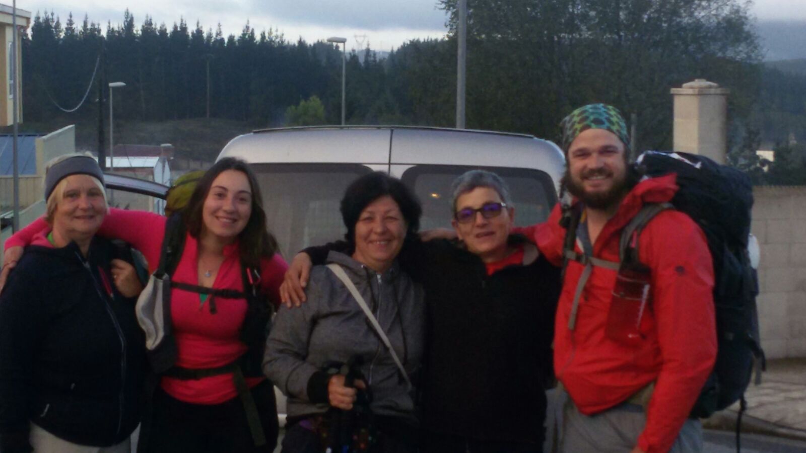 Ook vandaag zijn de vergezichten weer schitterend, maar dat betekent ook weer omhoog en omlaag en het venijn zit nu echt in de staart: 600 meter steil omhoog om in A Fonsagrada aan te komen en steil is ook steil. Het grappige is wel dat iedereen loopt te zwoegen en iedereen gezamenlijk blij is als we eindelijk boven zijn. Verrassing! Daar staan Ivan en Camilla ons op te wachten. Ze hebben geregeld dat de eigenaar van de camping ons bij het pelgrimsbureau ophaalt en dat scheelt zeker 2 km lopen. Gauw gezamenlijk boodschappen doen en dan naar ons pittoreske campinghuisje.